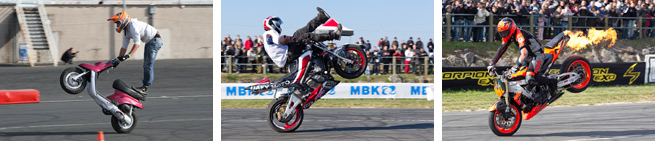 Durant leurs démos, les stunters réalisent des enchaînements de figures appelées tricks. Les plus connues sont les wheelings, stoppies et circles, et les plus impressionnantes sont les Christ’air ou serpillères… Si cela vous plaît, sachez qu’il est courant d’assister à des démos de stunt sur les meetings scooter, alors pourquoi s’en priver ?